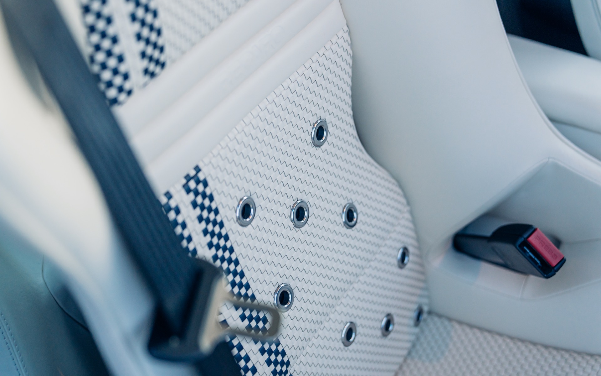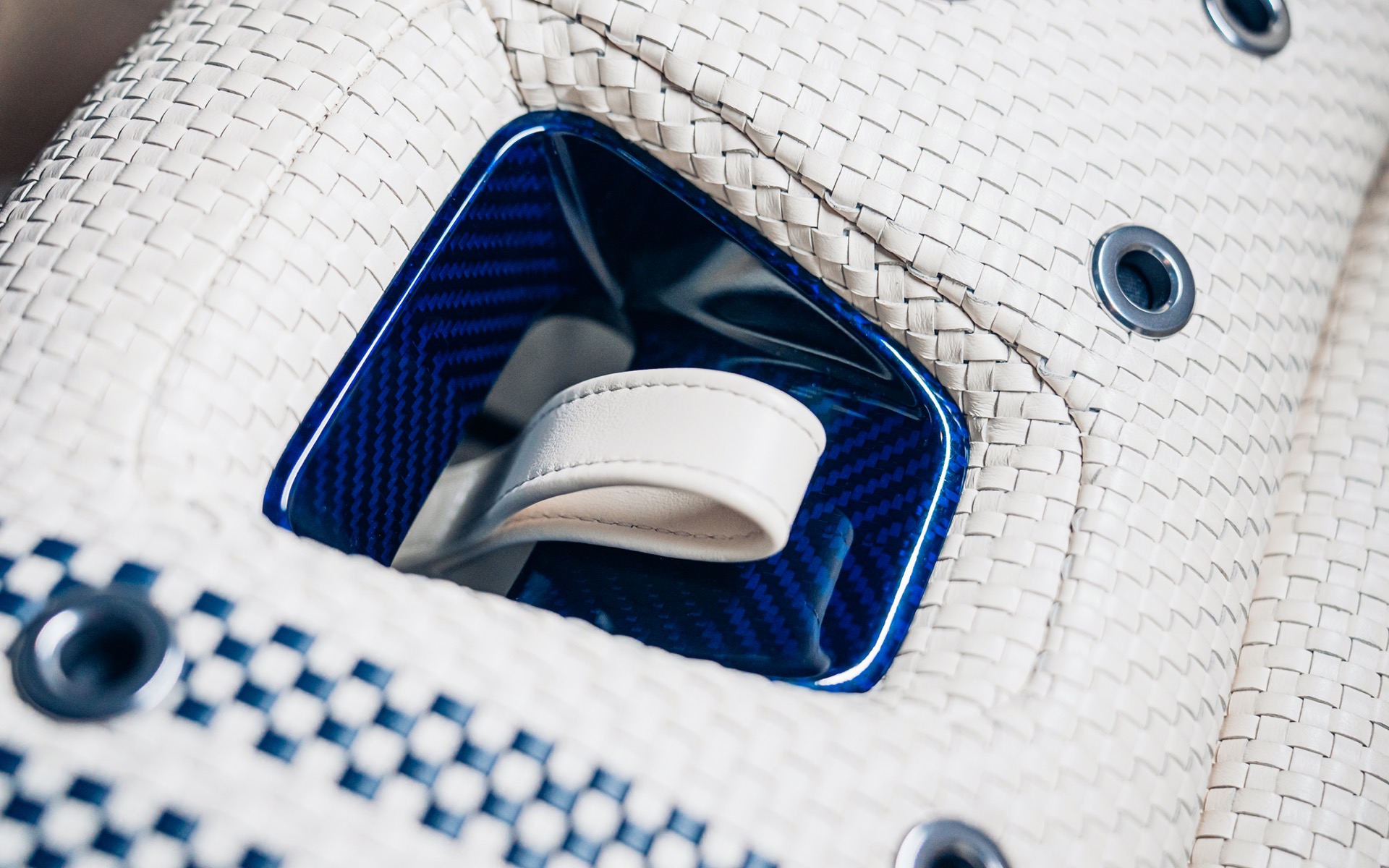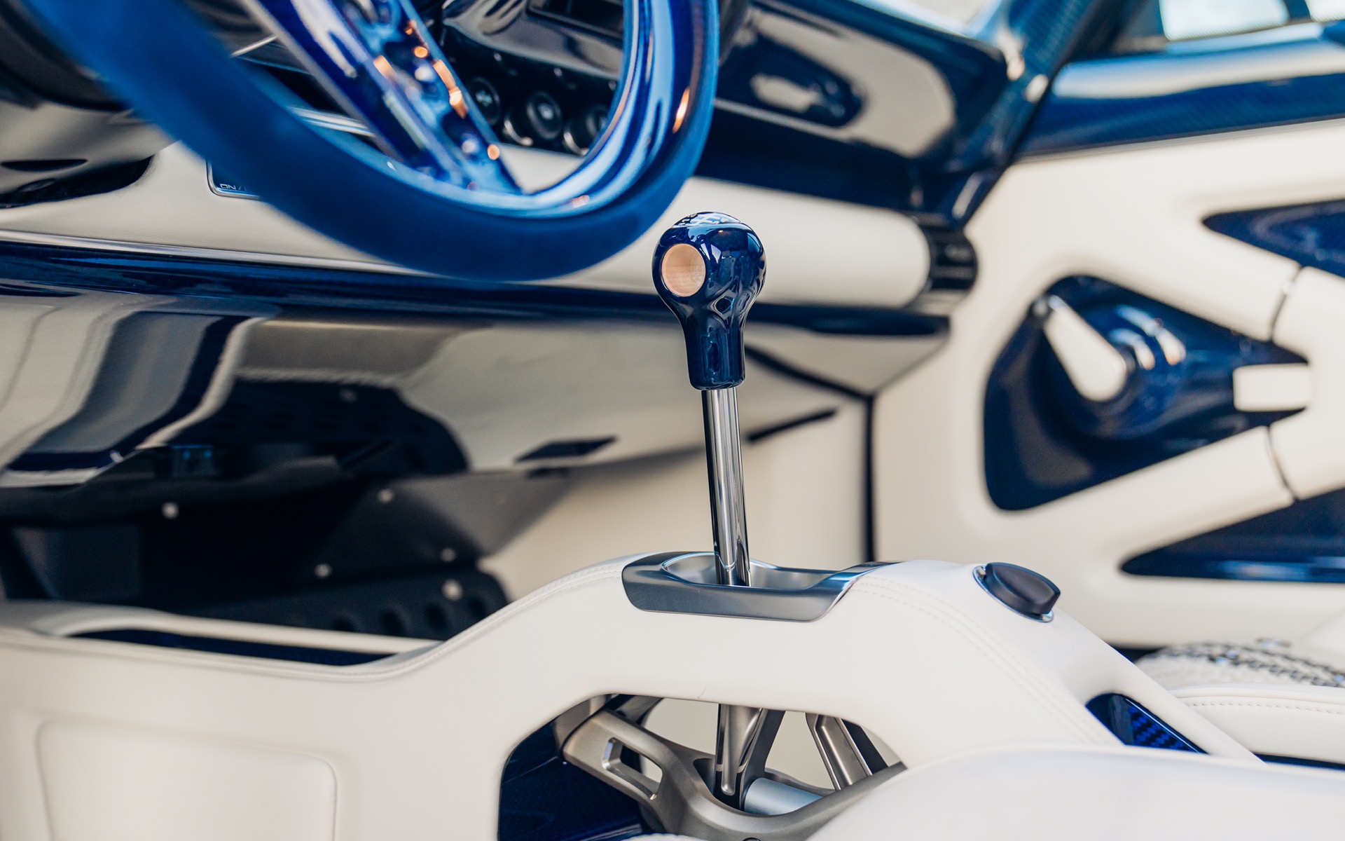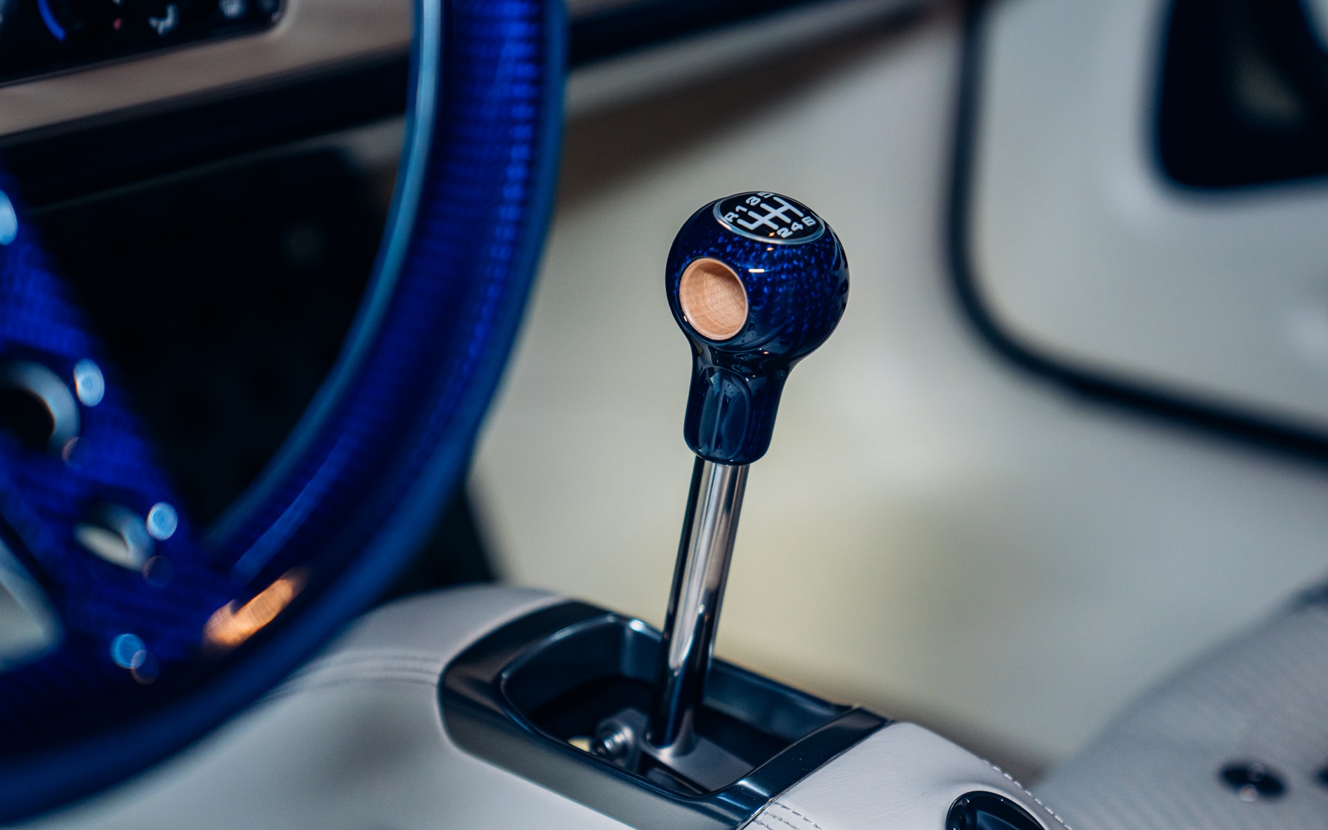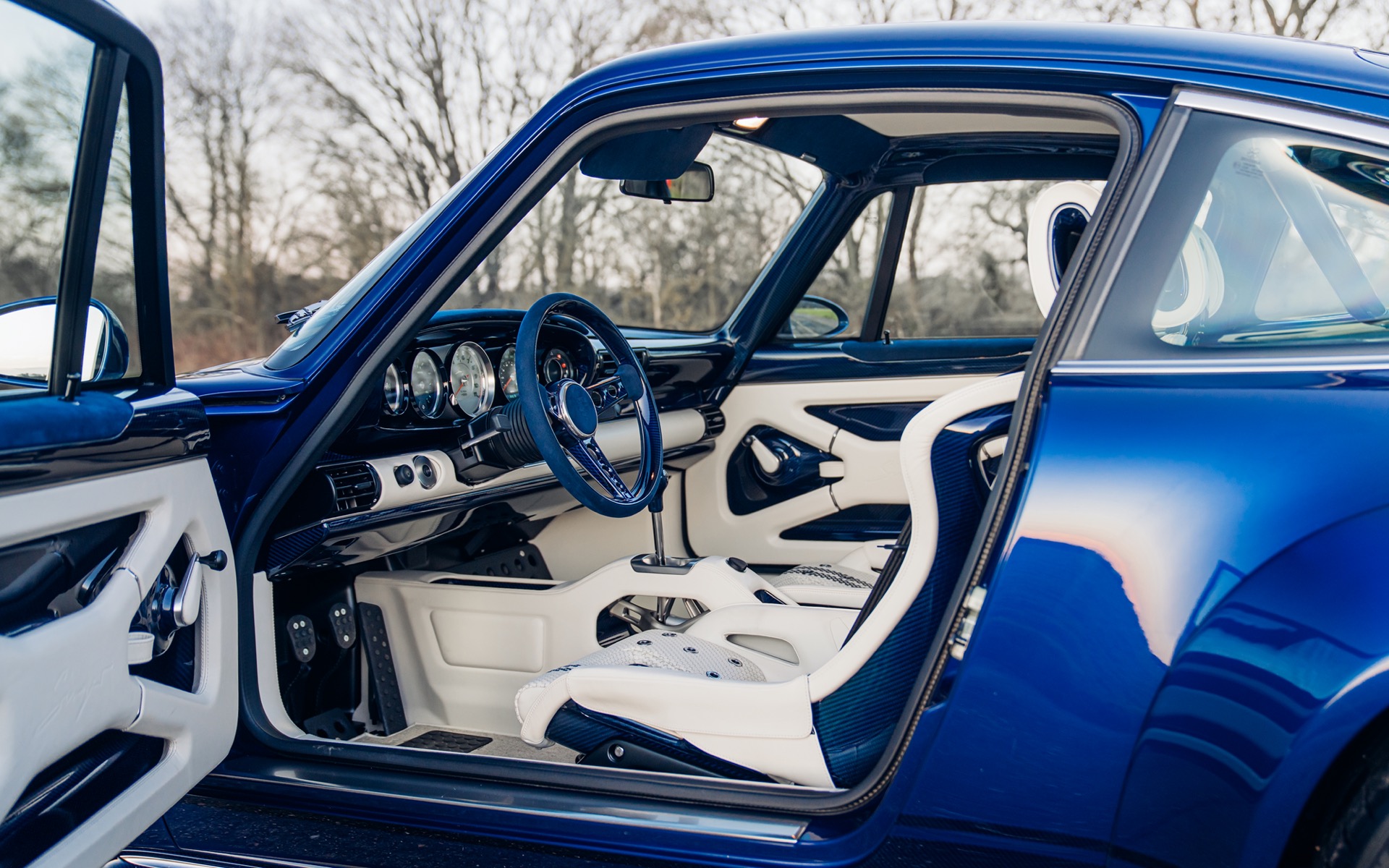 The interior is just as striking as the exterior, featuring Cream leather upholstery with Navy Blue Alcantara accents, perfectly matching the navy carbon fibre trim. The bespoke bucket seats feature a unique weave pattern, with navy blue double offset stripes running through the centre. Even the gearshift knob is finished in maple wood, a nod to classic Porsche racing cars.