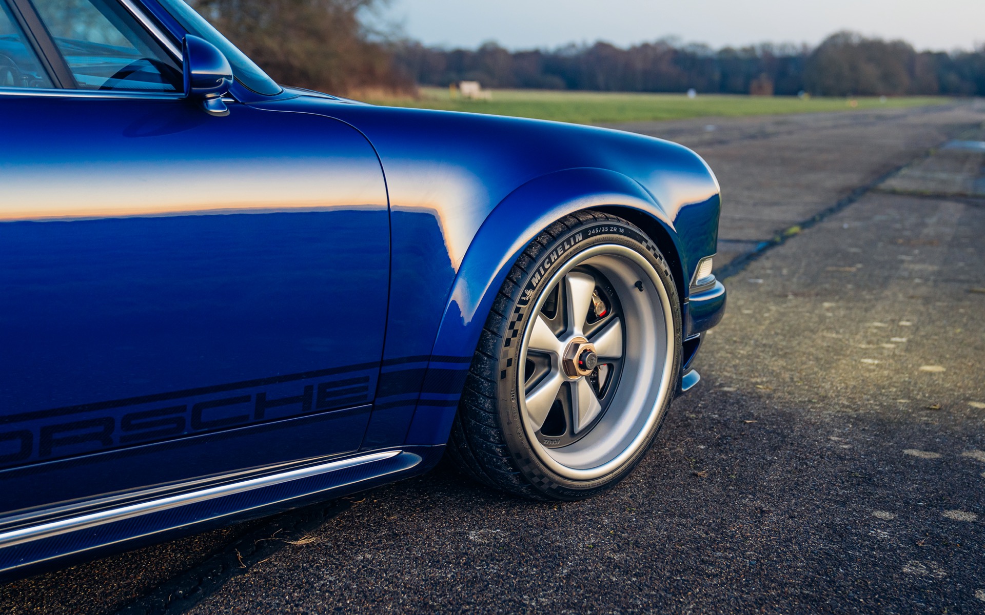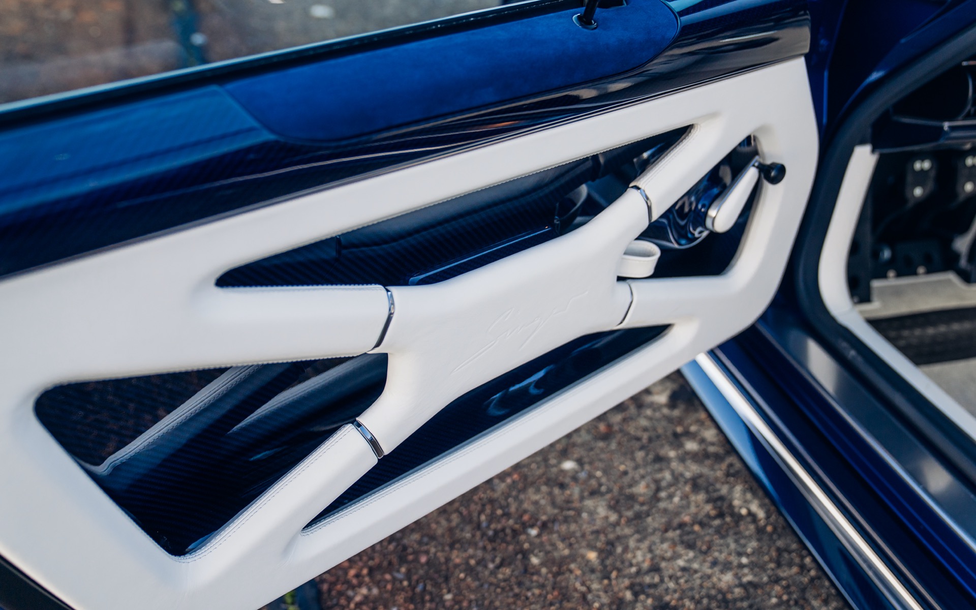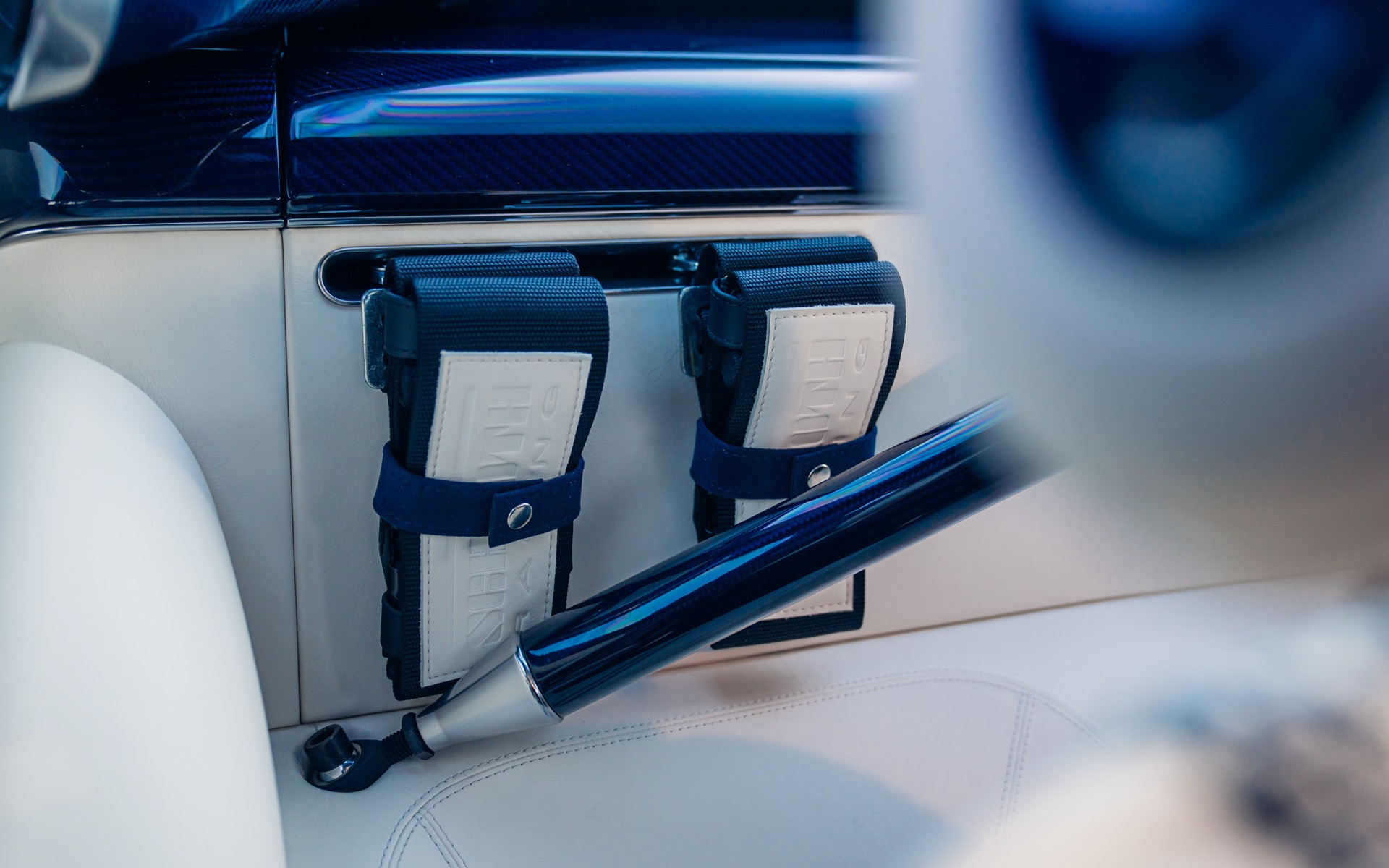 This particular Oppenheimer Commission was inspired by the legendary Oppenheimer Blue diamond. The Mercedes-Benz Brilliant Blue Metallic exterior is subtly contrasted by visible navy-tinted carbon fibre across the bodywork. Exposed carbon detailing in the Porsche script, front and rear trim lines, and smoked taillights add further sophistication. The brightwork is finished in polished titanium, enhancing the car’s understated elegance.