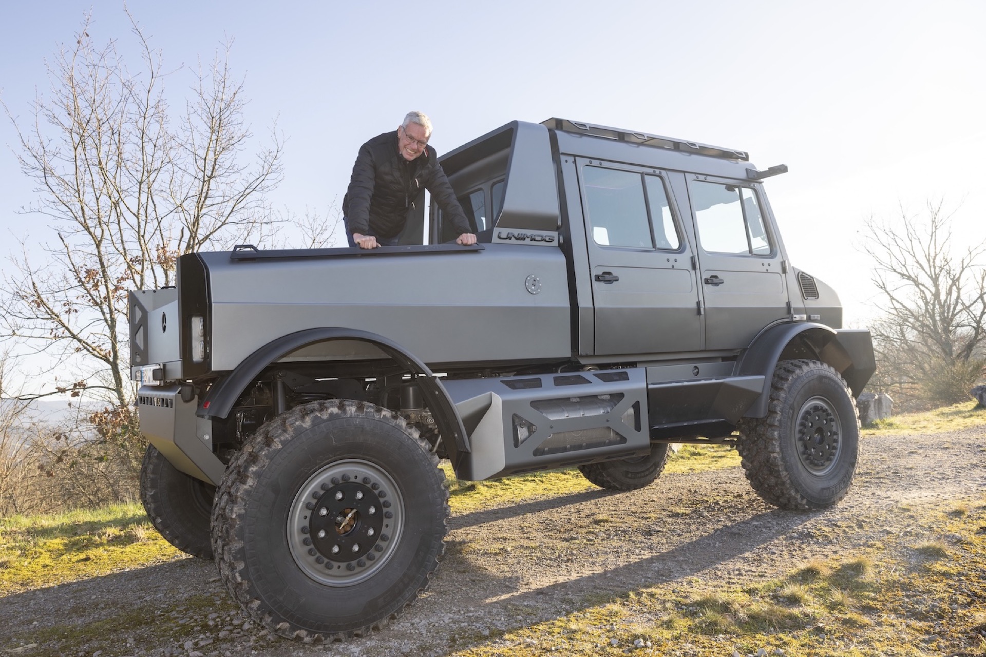 The exterior also receives a bespoke treatment. Revised bodywork, contemporary LED lighting and a matte metallic finish give the Unimog a distinctive presence, complemented by a sculpted rear bed. Practicality is not the priority here. This is about statement and capability.